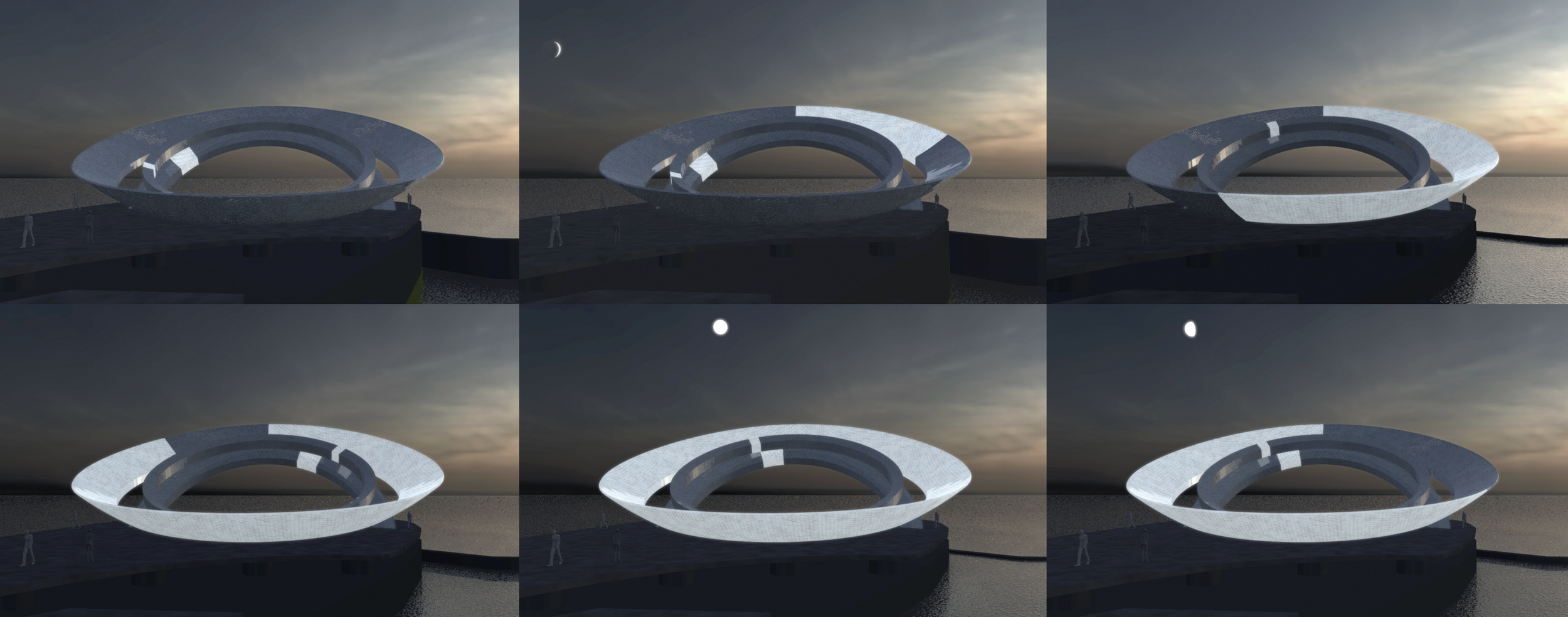 "Aluna will be the world's largest Moon, and the Tide Clock will be at 0Β° longitude on the Greenwich Peninsula in 2023. At 40m wide and 13m high, larger than Stonehenge, Aluna's distinct shape is formed of three vast translucent recycled glass rings representing the lunar phase, the lunar day and the tide cycles. The light slowly encircling the piece tracks the waxing and waning of the Moon, its movement across our sky, and the ebbing and flowing of the tidal Thames." - https://alunatime.org/